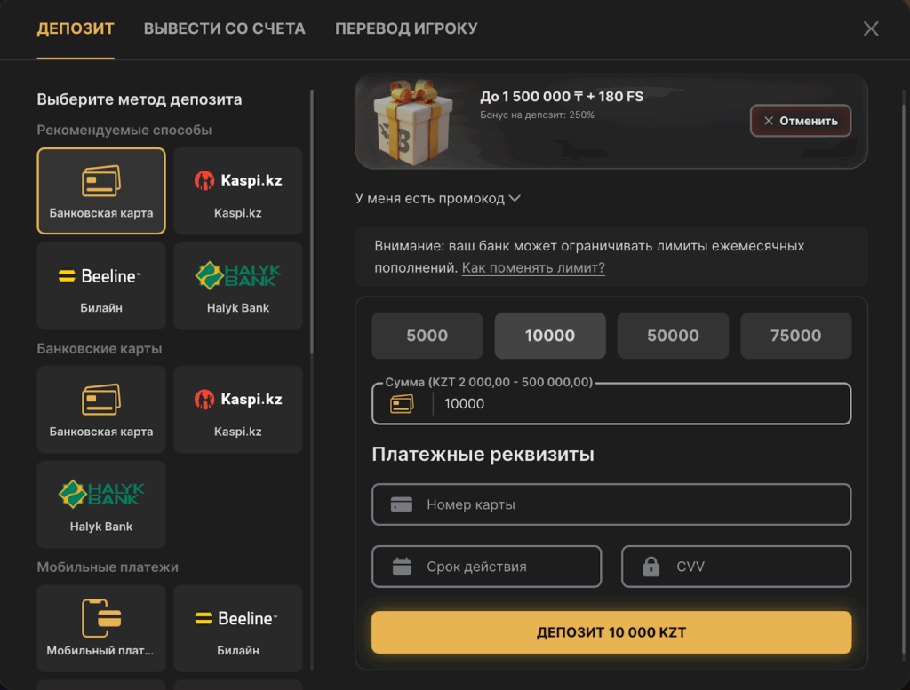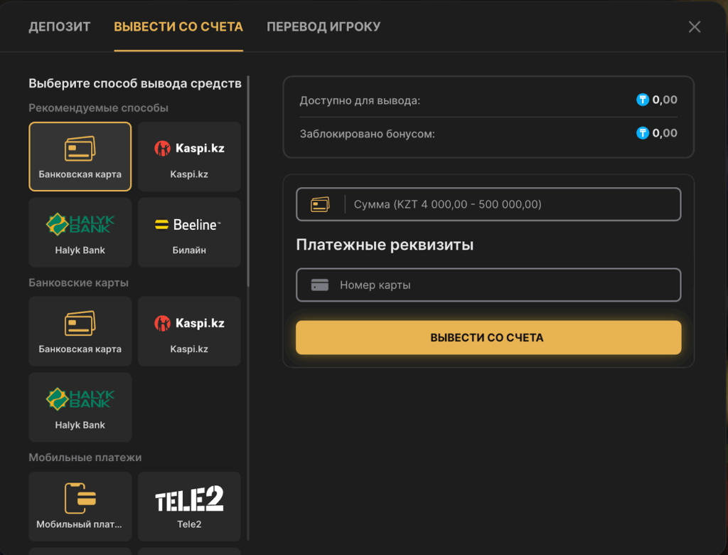 Минимальный депозит — 2 000 KZT, минимальный вывод — 4 000 KZT. Депозиты поступают мгновенно, выводы рассматриваются до суток, а зачисление зависит от банка или криптосети и может занимать до пяти рабочих дней.